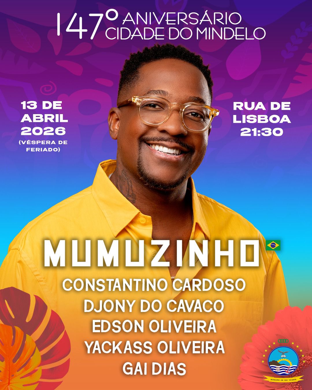 🎶 MOMENTO MUSICAL – 147º ANIVERSÁRIO DO MINDELO 🎉 A cidade do Mindelo prepara-se para viver uma noite inesquecível de celebração, música e muita energia, na véspera do feriado municipal! No dia 13 de abril, a emblemática Rua de Lisboa será palco de um grande espetáculo que reúne talentos nacionais e internacionais, num verdadeiro encontro de ritmos e emoções. 🌟 Artistas confirmados: * Mumuzinho (Brasil); * Constantino Cardoso; * Djony do Cavaco; * Edson Oliveira; * Yackass Oliveira; * Gai Dias. 📍 Local: Rua de Lisboa, Mindelo 🗓? Data: 13 de abril 🕘 Hora: 21h30 Venha celebrar connosco os 147 anos da nossa querida cidade do Mindelo, num ambiente de festa, cultura e morabeza, onde a música será o grande elo de união. Não fique de fora desta grande noite!