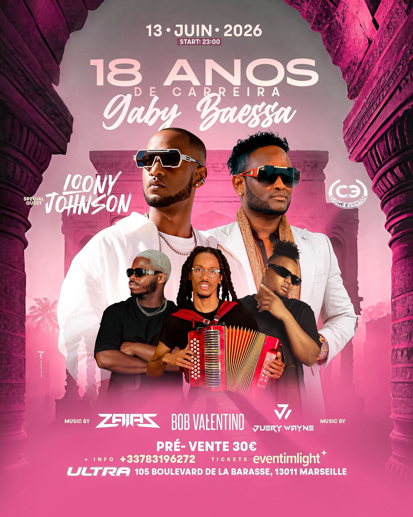 🔥 18 ANOS DE CARREIRA – GABY BAESSA 🔥 📅 13 JUIN 2026 🕚 Start : 23H00 📍 ULTRA – 105 Boulevard de la Barasse, Marseille 🎤 Avec : Gaby Baessa 🔥 Special Guest : Loony Johnson 🎶 Bob Valentino – Zeips – Juery Vayne 💥 Une soirée exceptionnelle pour célébrer 18 ans de carrière ! Ambiance 100% live, vibes capverdiennes & show explosif au rendez-vous 🔥 🎟 Pré-vente : 30€ 🚨 Billets disponibles en ligne : 👉 https://vibra.cv/wAprYlzBlL 📲 Infos & réservations : +33 7 83 19 62 72 Places limitées – prends ton billet maintenant !
