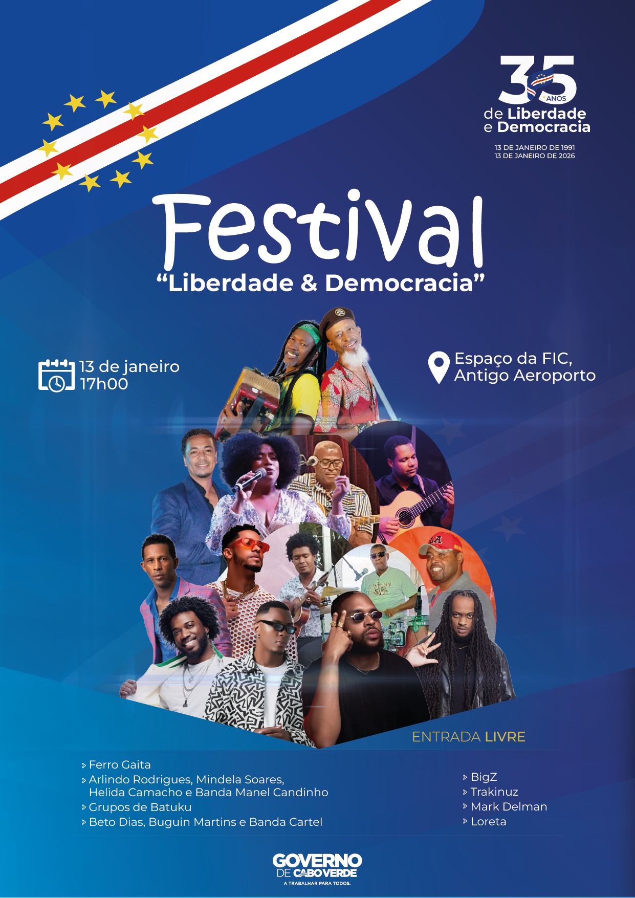No dia 13 de janeiro, a música, a cultura e a diversidade juntam-se para dar voz aos valores que moldaram Cabo Verde ao longo dos últimos 35 anos. O Festival “Liberdade & Democracia” reúne artistas de diferentes gerações e estilos num encontro que celebra a liberdade de expressão, a participação cívica e a força da nossa identidade. A partir das 17h00, no Espaço da FIC – Antigo Aeroporto, o palco será ocupado por quem transforma a arte em mensagem e a música em união. Uma celebração viva da democracia, feita com sons, ritmos e emoções que pertencem a todos os cabo-verdianos. Entrada Livre. Junte-se a nós nesta data histórica.