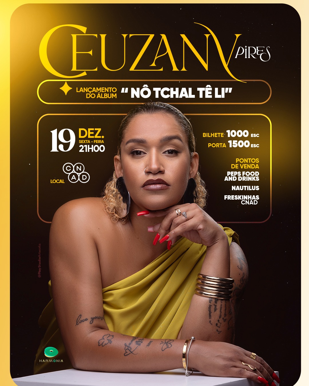 🚨É com imensa alegria que anunciamos o tão esperado concerto de lançamento do Álbum "NO TCHAL TÊ LI" da cantora Ceuzany Pires no dia 19 de Dezembro na CNAD. Já pode adquirir o seu bilhete nos principais pontos de Vendas: - Peps Food and Drinks - Nautilus - Freskinhas - CNAD 📅19 de Dezembro 📍CNAD 🕙 21:00 h 🎫 1000$00 Porta 1500$00