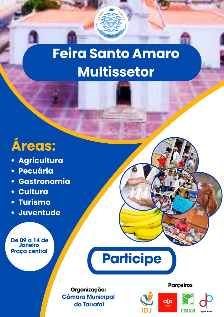 Feira Santo Amaro Multissetorial De 09 a 14 de janeiro, o Município do Tarrafal acolhe a Feira Santo Amaro Multissetorial, um espaço de promoção e valorização do potencial económico, cultural e turístico do Concelho. A iniciativa abrange áreas como turismo, cultura, artesanato e gastronomia, reunindo expositores, produtores locais, artesãos, operadores turísticos e agentes culturais. Para além da vertente expositiva e comercial, a feira inclui animação cultural, demonstrações gastronómicas, apresentações artísticas e promoção de produtos locais, contribuindo para a dinamização da economia local e o convívio entre a comunidade e os visitantes.