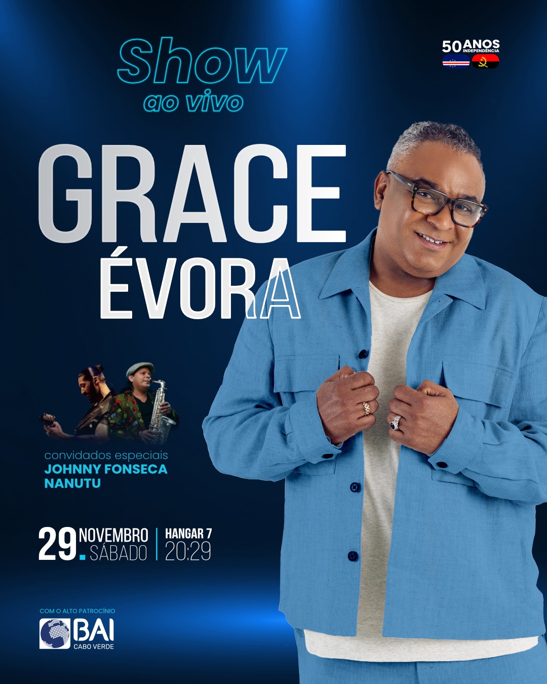 Hoje desvendamos a surpresa Grace Évora ao vivo, num show inesquecível, para celebrar os 50 anos de independência de Cabo Verde e Angola. 29 de novembro, Hangar 7, às 20:30 Não perca!