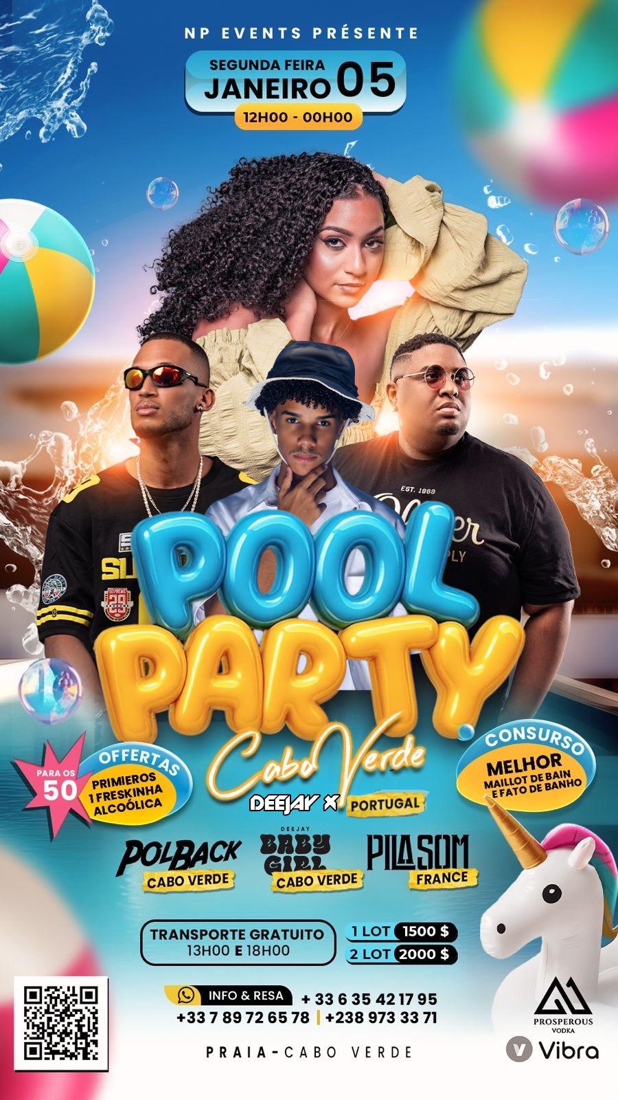 🌴 NP EVENTS apresenta: POOL PARTY 2026 🌴 🗓 Segunda-feira, 5 de janeiro 2026 📍 Local: Praia Das 13h00 às 00h00 🚐 Transporte gratuito (9 lugares) incluído com a pré-venda 🕝 Saídas da viatura: 12h30 e 18h00 🕕 Regresso: entre as 23h30 e 00h00 🎧 Line-up explosivo com DJs de: Portugal • França • Cabo Verde 💥 Mesas disponíveis: 🥂 Mesa VIP • 🍹 Mesa Normal 🎟 Preços (pré-venda): 1º lote — 1500 escudos 2º lote — 2000 escudos 🔥 Ambiente garantido – Sol, música e boas vibrações! 🌊 💦 Atividades & Diversão • 💧 Pistolas de água • 🎈 Balões com água • 🏐 Bola de piscina • 🦩 Boias divertidas (flamingos, frutas, unicórnios, etc.) • 🎉 Brinquedos insufláveis 🍹 Animação Especial • 👙 Concurso “Melhor Maillot de Bain” (Melhor fato de banho) • 🍾 Distribuidor de bebidas alcoólicas — staff dedicado a servir shots durante a festa 🎁 Ofertas para os 50 primeiros • 🍸 1 Freskinha alcoólica de boas-vindas • 🌺 Colar havaiano • 💦 Pistola de água 🥂 Espaços VIP & Mesas 🌟 Mesa VIP inclui: • 🍾 1 garrafa premium (vodka, gin ou whisky) • 🍉 Tábua de frutas exóticas • 🕶 Óculos de sol personalizados • 🎲 Jogos de mesa (cartas, dominó, etc.) • 🎁 Surpresas e brindes exclusivos 🍹 Mesa Normal inclui: • 🥃 1 garrafa (vodka ou whisky) • 🧃 Red Bull e sumos mistos 🎧 Música & Atmosfera • DJ set com os melhores ritmos de verão: afro, reggaeton, funk, kizomba e house tropical • Efeitos de espuma, luzes e muita energia 🔥