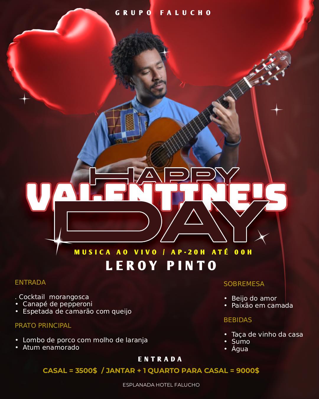 DIA 14 ESPLANADA HOTEL FALUCHO E A MELHOR OPÇÃO 🥰🥰🥰?????? ESTAMOS A SUA ESPERA TEMOS 👉 JANTAR PARA CASAL 3500$ 👉JANTAR + 1 QUARTO PARA CASAL 9000$ Tem música ao vivo com???? LEROY PINTO👌👌👌👌