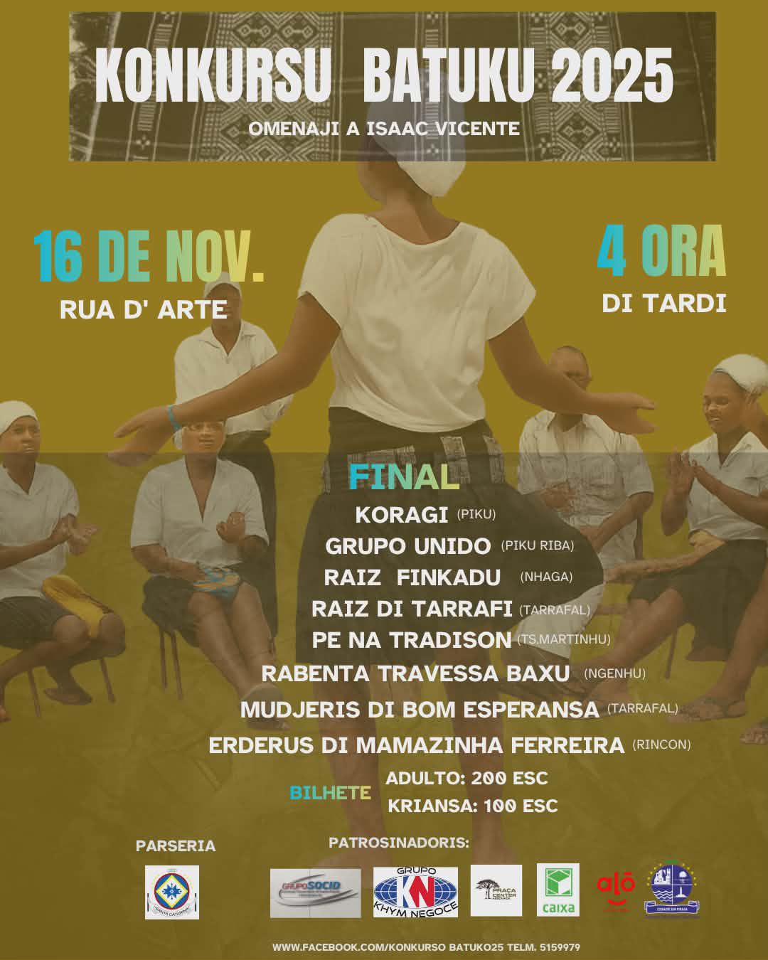 Bon dia!!! E es DUMINGU dia 16 di NOVEMBRO GRANDI FINAL DI KONKURSU DI BATUKU. NHOS PRIPARA PAMODI TA BAI TEN TXEU SUPREZA. Jocel Gomes & amigu ta bai akesenu ispasu ku COTXI PO i mutu mas supreza.